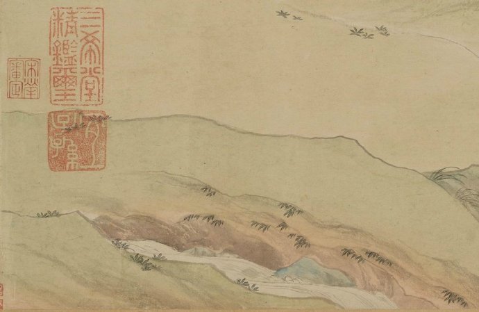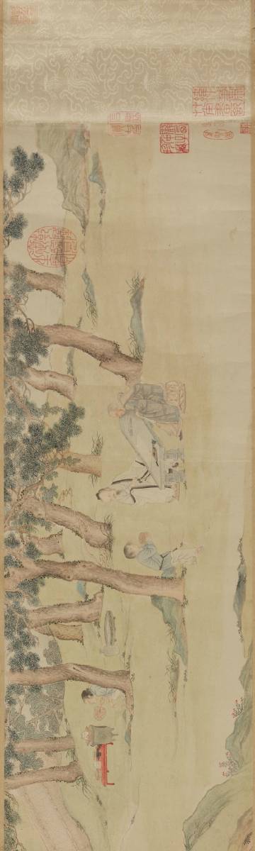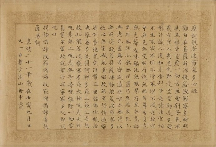 书画合璧《赵孟頫写经换茶图卷》 仇英作画,文征明写《摩诃般若波罗密多心经》。本画描绘赵孟頫写般若经与和尚换茶的故事。