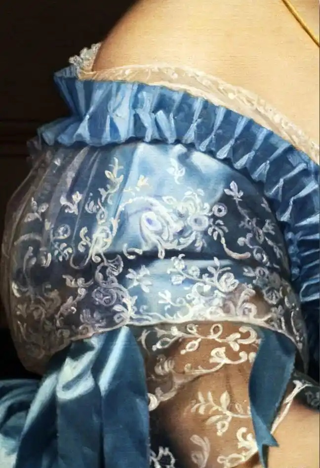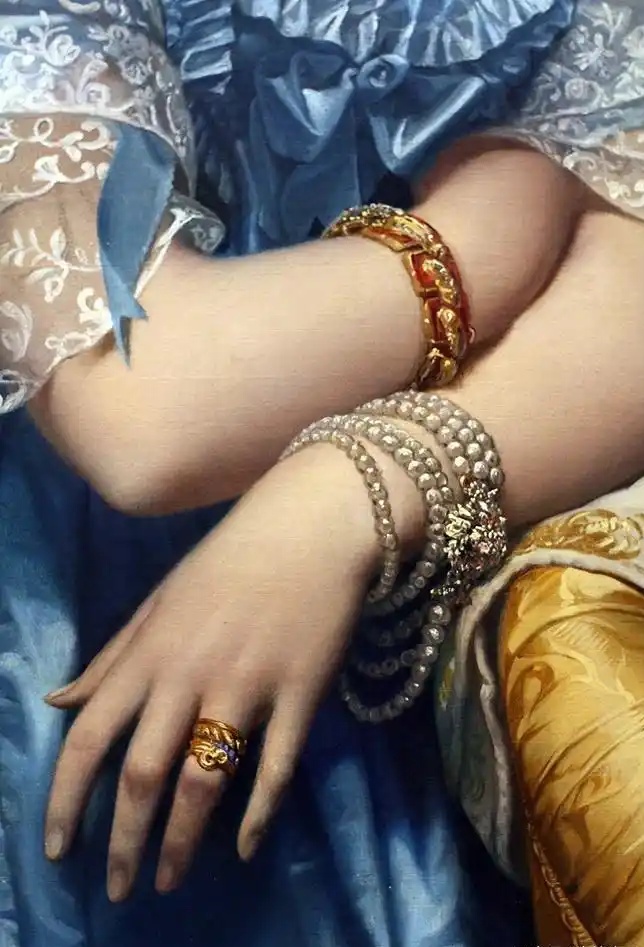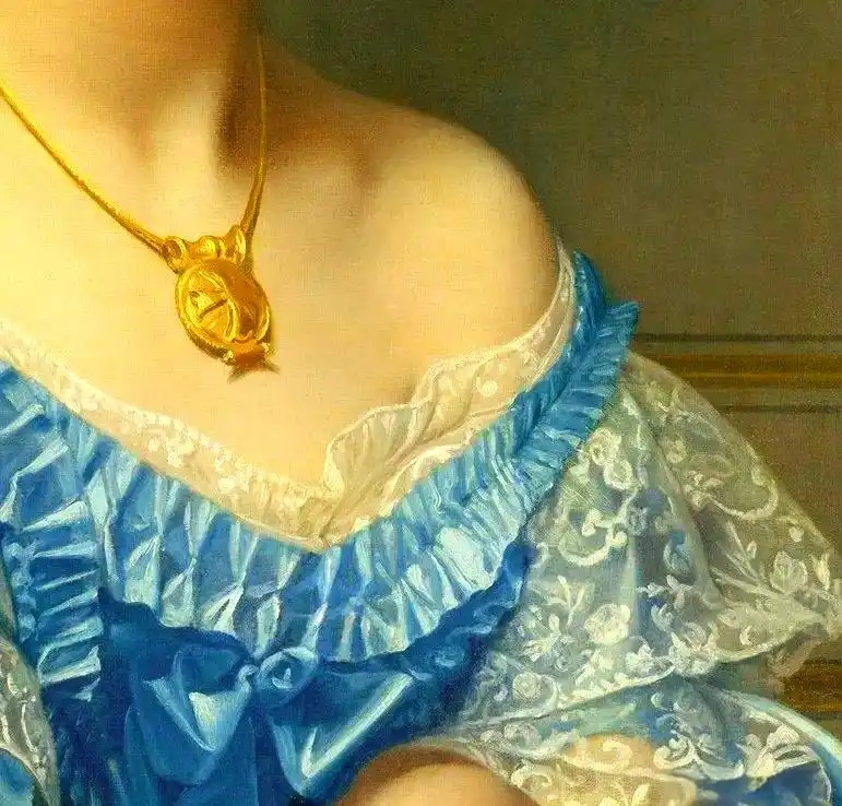 《勃罗日里公爵夫人像》,亦被称为《布罗格利公主》,生动描绘了一位优雅贵妇形象。画中精巧的细节、流畅的线条以及清纯的色彩,无不展现出安格尔独特的艺术风格。通过对面部与物件的细腻描绘,展现了其精湛的绘画技艺,画面造型饱满圆润,线条流畅柔美,色彩清纯恬淡,共同衬托出女主人公的高雅气质。模特儿裸露的削肩以及胸部至腰部的巧妙构图,体现了安格尔独特的艺术匠心,使得整个画面更加和谐统一。