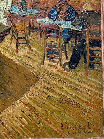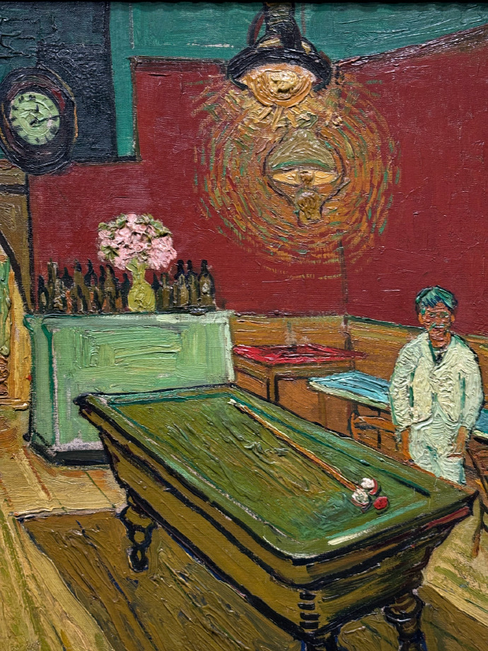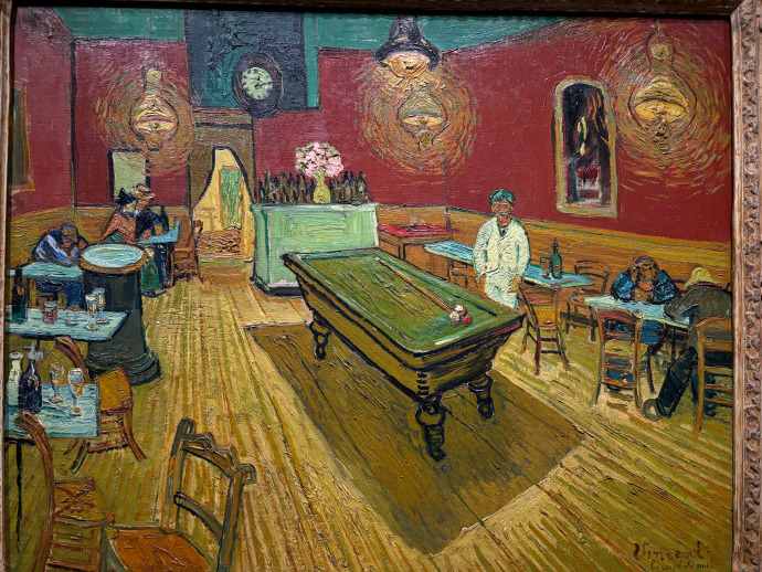 梵高从1888年的5月到9月都借住在兰卡散尔咖啡馆,由于咖啡馆通宵营业,因而被称之为“夜间的咖啡馆”。此刻的梵高已慢慢地在画面上显露出他那种繁杂而不安、彷徨而紧张的精神状况。