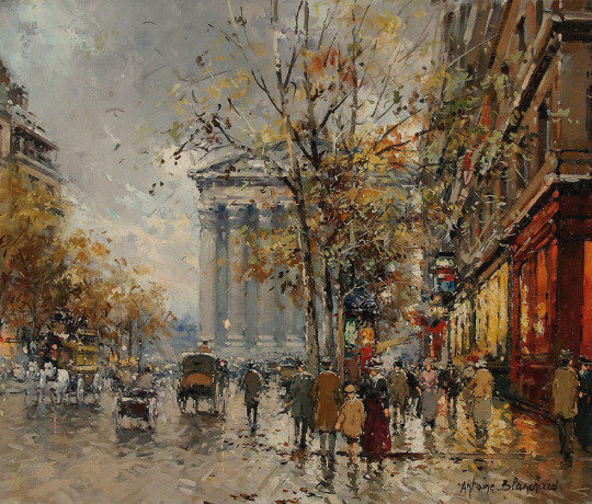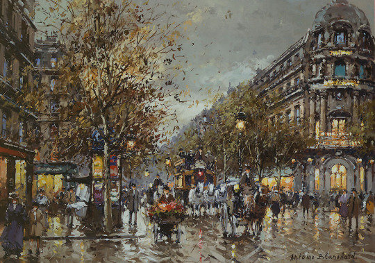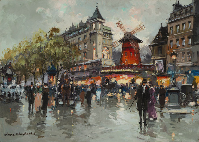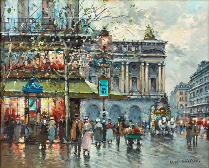 法国画家Antoine Blanchard笔下浪漫的巴黎。Blanchard 曾获得过罗马大奖,他的作品主要描绘不同季节和天气之中巴黎的美丽街景,喧嚣热闹的大街,有着明亮灯光的店铺,熙熙攘攘的人群是他画作的主要主题。