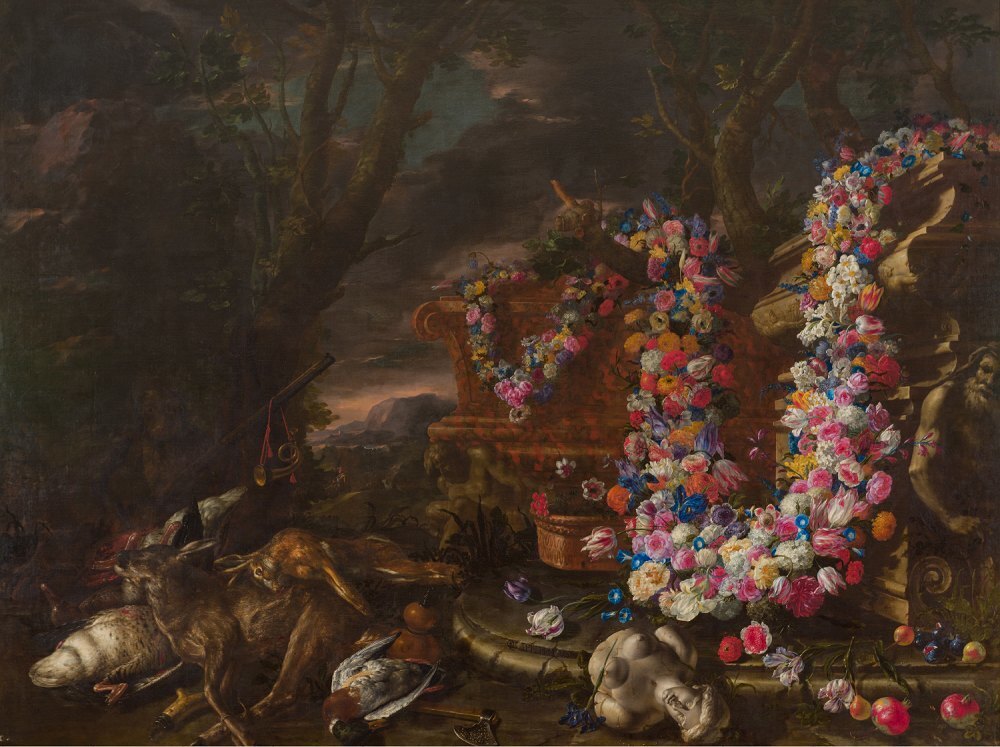 《花卉与猎物静物画》,Giuseppe Recco,1671年,布面油画