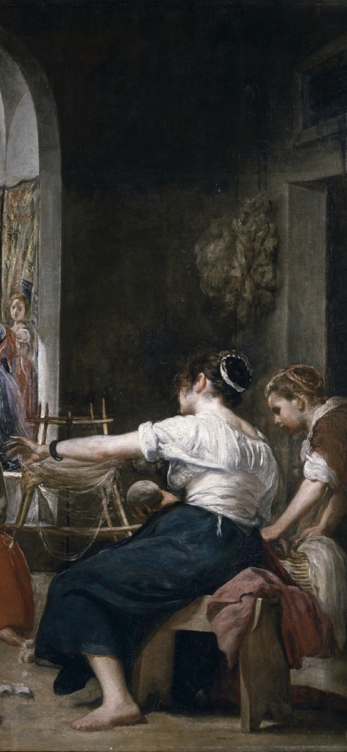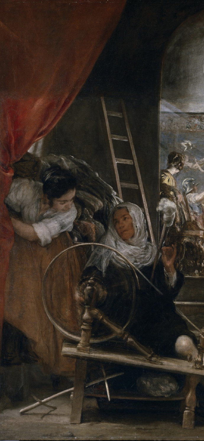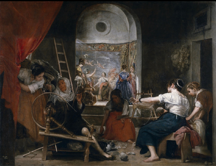 这是委拉兹凯支晚年最主要的作品之一,画中描绘了两个不同的阶层:一边是正在悠闲欣赏壁毯的宫中贵妇,一边是马德里皇家织造厂繁忙而疲惫的女工