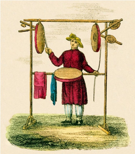 3. 云锣,一种扬琴或编钟,由 10 个铜管乐器组成。中国人有时会用前面提过的响声石制造出效果相似的乐器。