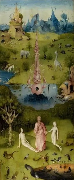 左侧部分:描绘了上帝创造亚当和夏娃的场景,象征着人类的起源与纯真。这里的色彩鲜艳,充满生机,展现了人类与自然和谐共处的美好时光。