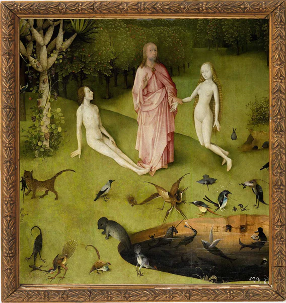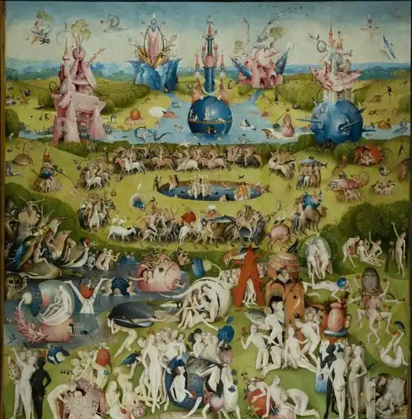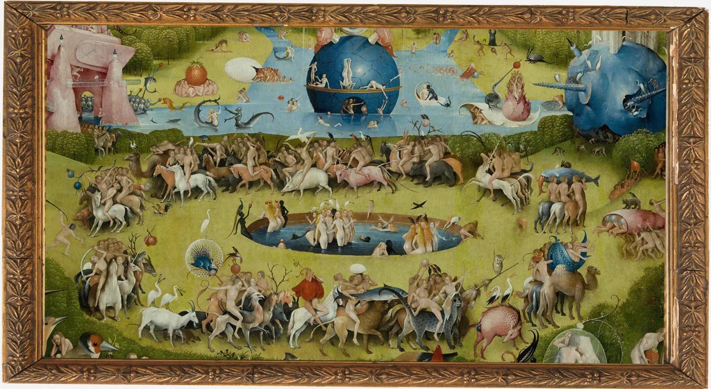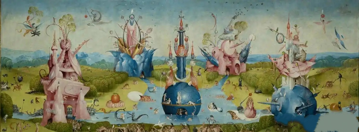 《人间乐园》是荷兰画家 Hieronymus Bosch(耶罗尼米斯·博斯)最具代表性的作品之一,创作于15世纪末至16世纪初。这幅画不仅展示了博斯超凡的想象力和精湛的技艺,更通过其怪诞而富有寓意的场景,向观者传达了对人类本性的深刻反思和警示。
