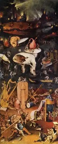 右侧部分:则暗示了人类堕落后的后果,描绘了地狱的景象,充满了痛苦与惩罚。这里的色调变得阴暗,场景充满了恐怖与绝望,警示着人类欲望的最终归宿。