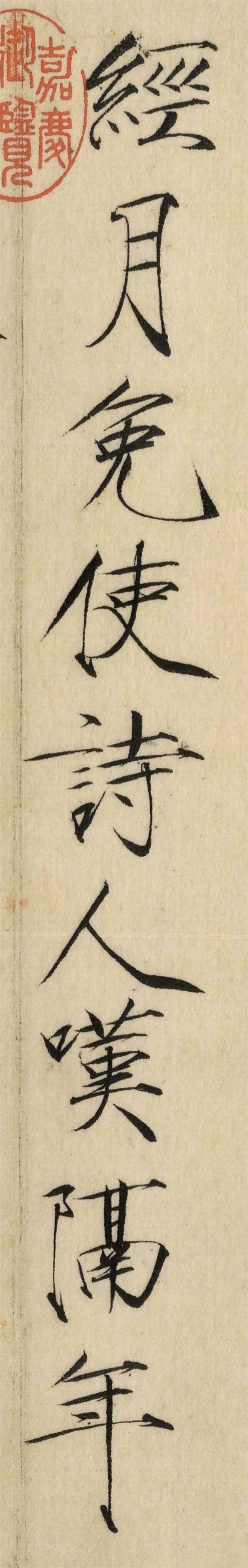 北宋皇帝徽宗赵佶的书法早年学薛稷、黄庭坚,后又参合褚遂良诸家,形成了自己的独特风格。其字线条瘦直挺拔,横画收笔带钩,竖画收笔带点,撇如匕首,捺如切刀,竖钩细长。赵佶荒废朝政、一心沉溺于书画艺术,而他的美学标准也变得大背传统,形成了独特的艺术风格。这幅法帖用笔刚健挺拔又不失妩媚,尽显帝王之书的华丽之美,又与诗境相合。故宫博物院藏。