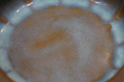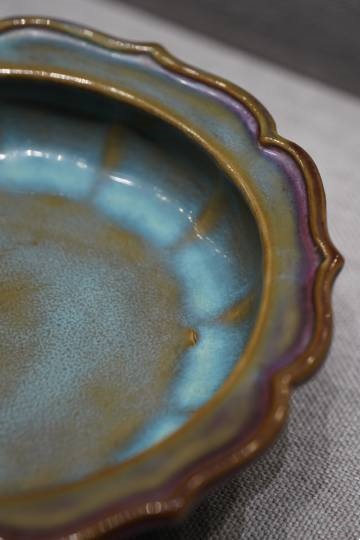 北宋遗存,造型规整,工艺考究,明亮鲜丽,上乘之作。花盆托以凹、凸线构成六瓣菱花形。敞口,折沿,浅腹,弧形腹壁,底下承以三个云头形足。器身的玫瑰紫釉与边、棱自然形成的酱黄色釉相映成辉,这种釉色的烧成是北宋河南禹县钧窑工匠的创举,灿烂的玫瑰紫色釉是铜金属元素在强还原焰的气氛下烧成后的呈色。器里釉呈天蓝色,釉面上有明显的“蚯蚓走泥纹”。外底涂抹酱色釉,刻数目字“十”