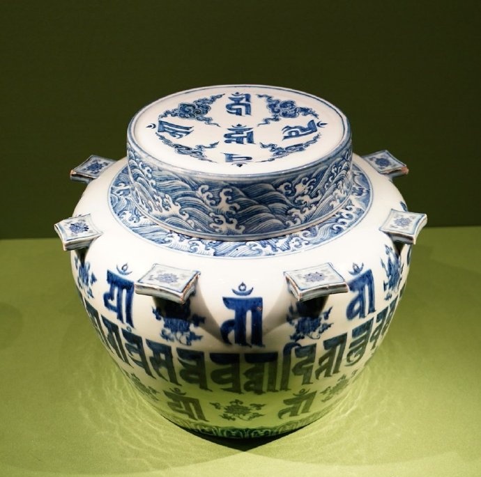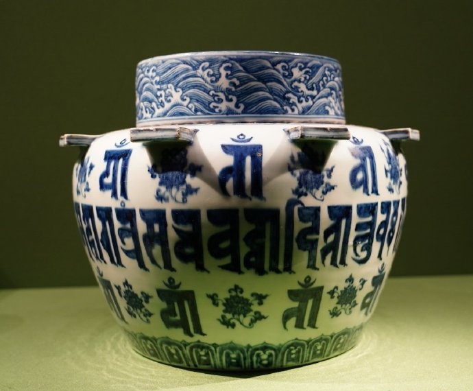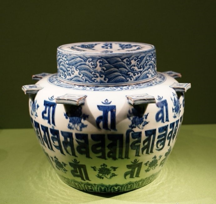 罐直口,短颈,平肩,鼓腹,下部微向内收,平底,肩部有八个长方形平板出戟。罐外壁自上而下分层饰海水纹、八吉祥纹、蓝查体梵文和莲瓣纹等;内底双线圈外,九个莲瓣内各书写一梵文,双线圈内自左向右署篆体"大德吉祥场"款。