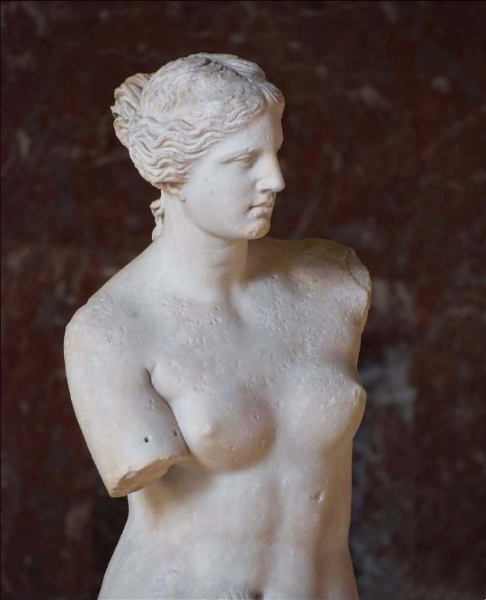 仔细看,就像许多古代雕像一样,维纳斯的身体并非由一整块石头雕成,而是由多块帕罗斯大理石拼接而成。她的上身与下身原本是分开雕刻的,但拼接的部分被巧妙地藏在了她腰间的衣褶下,因此几乎难以察觉。