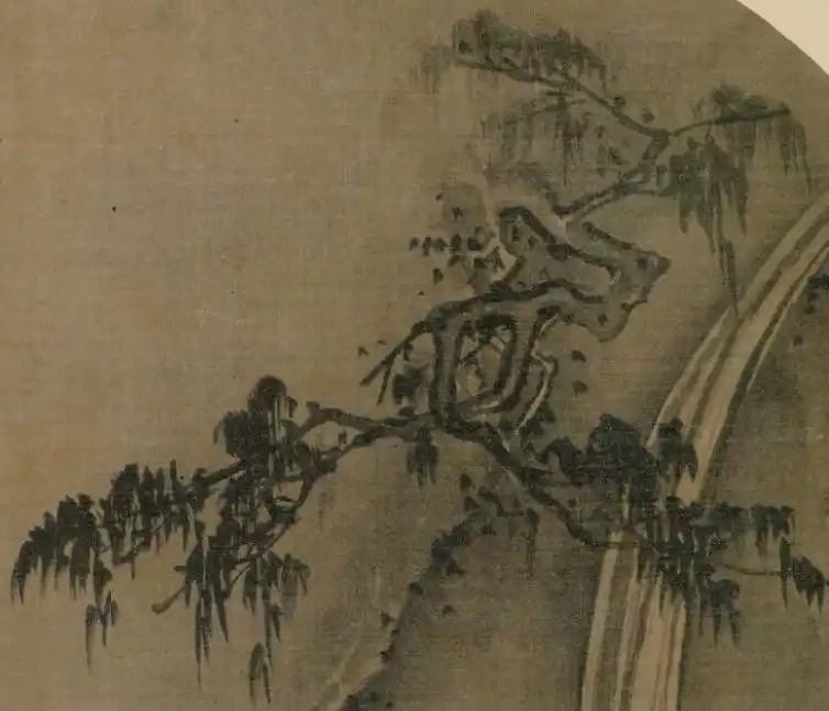 首先,松树悬于山间,空间远近通过墨的浓淡来区分,树叶比较稀疏,不够浓密。