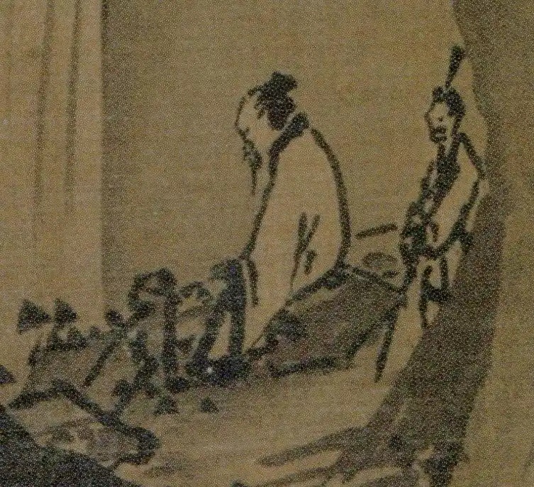 其次,松树下面有两个人,一个坐在石头上,双手扶膝,低头向下观望;另一个站在后面,双手合并置于身前,部分身躯被山石挡住。二者身高比例一大一小,根据古人作画习惯可以判定二者是主仆关系。