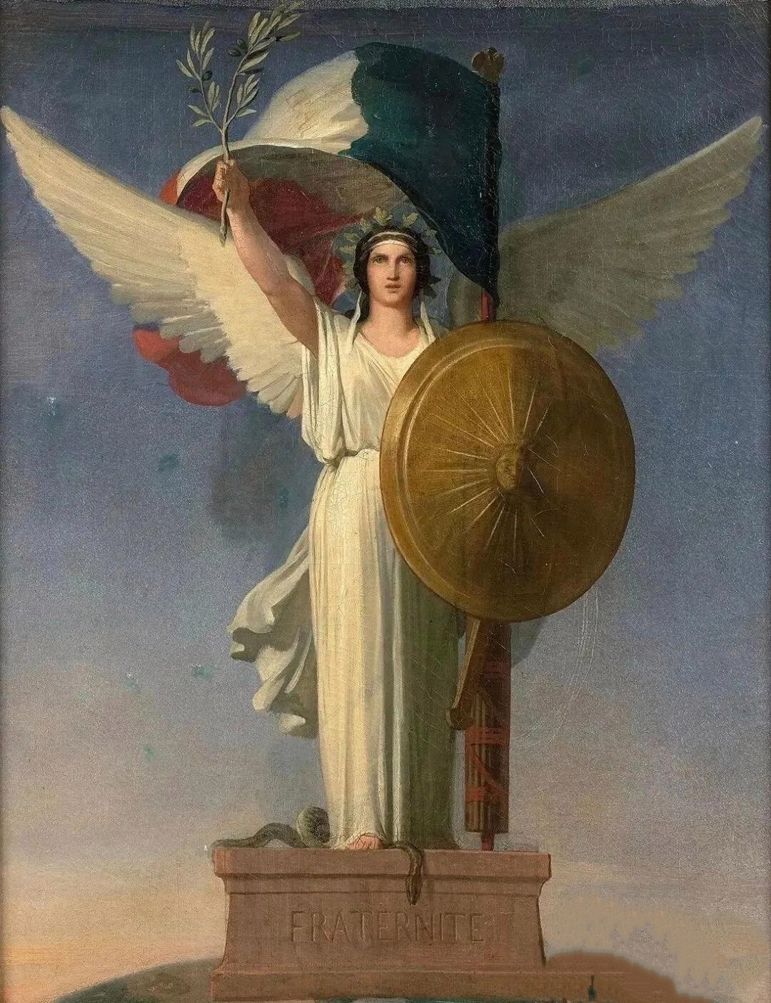 - 主体为带翼的自由女神形象,手持橄榄枝(象征和平)与法国三色旗,身侧的青铜盾借鉴古希腊盾牌形制,基座刻有法语“FRATERNITE”(博爱),对应法国大革命“自由、平等、博爱”的核心理念;