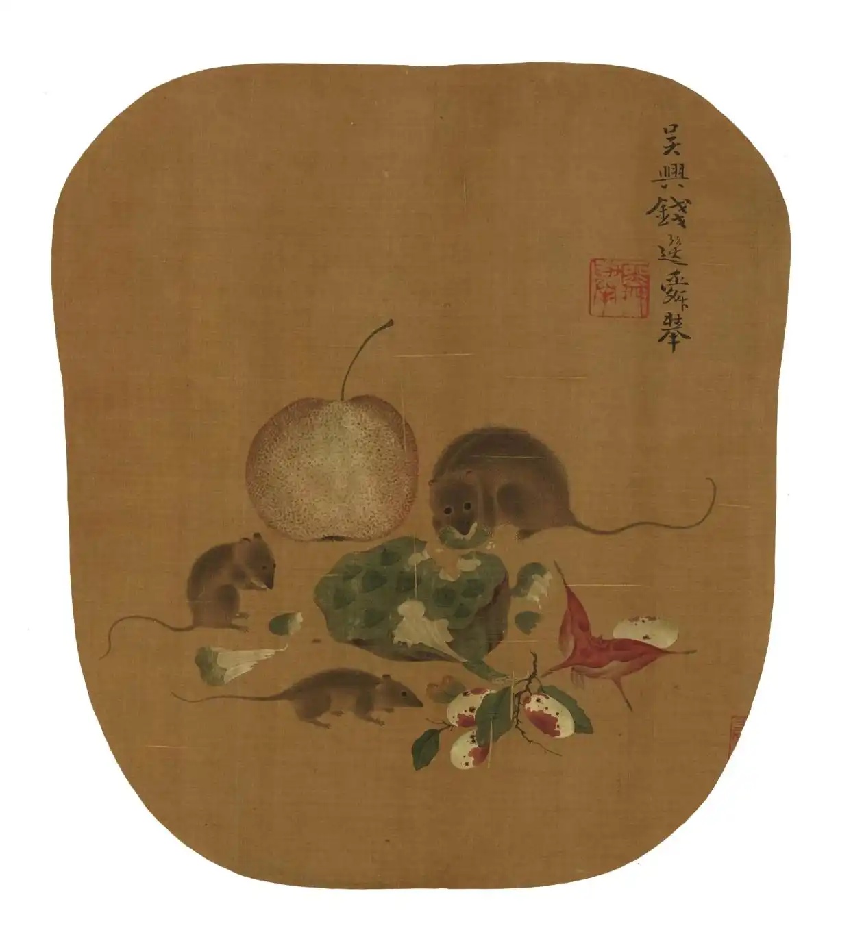 《莲实三鼠图》作者元代钱选,绢本设色,尺寸28.2厘米 x 24.3厘米,现藏于台北故宫博物院