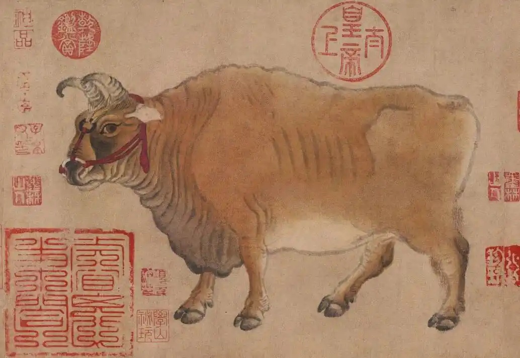 《五牛图》作者唐朝韩滉,纸本设色,尺寸20.8厘米 x 139.8厘米,现藏于北京故宫博物院