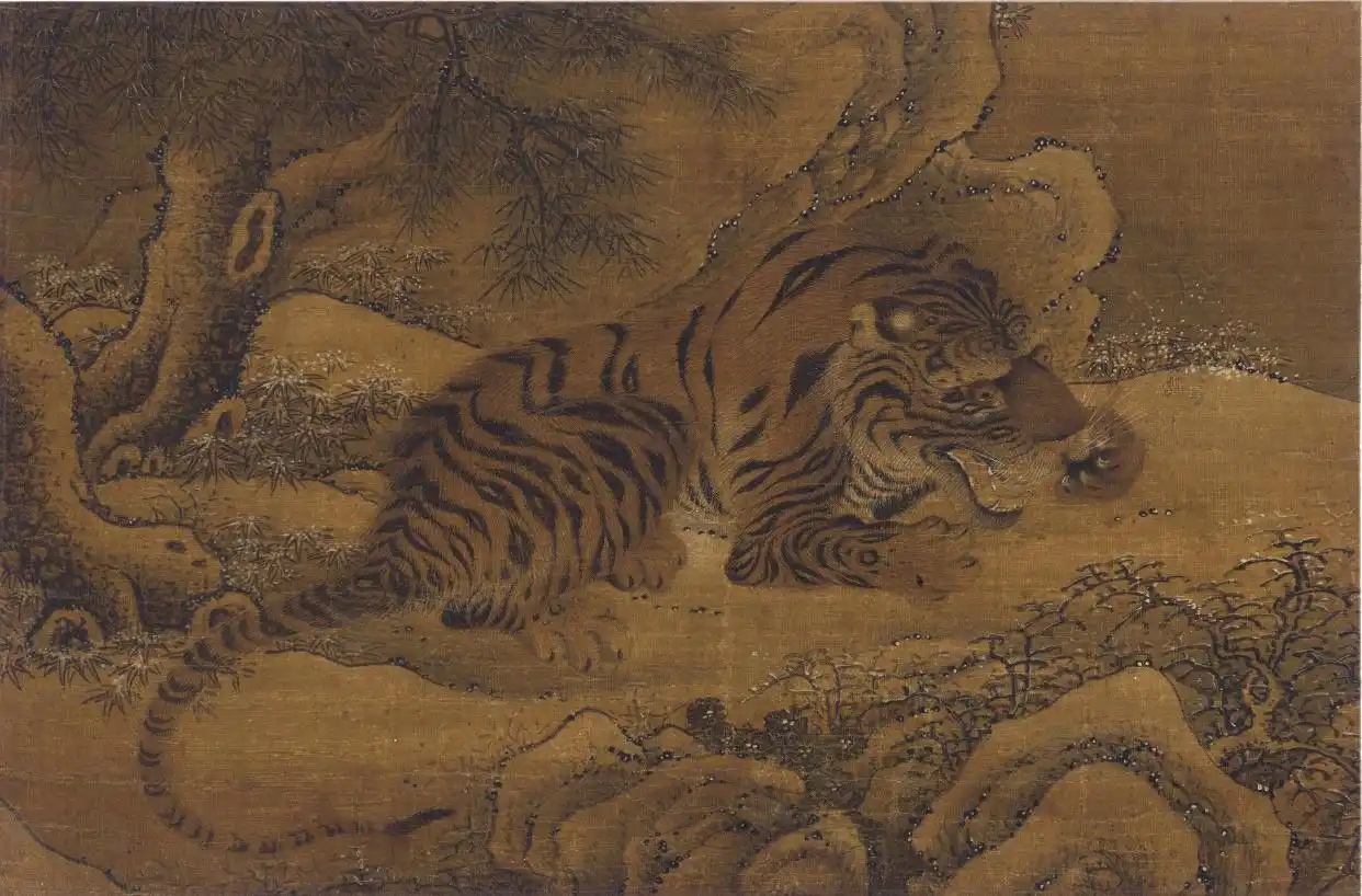 《松荫雪虎图》作者明代佚名,绢本设色,尺寸26.1厘米 x 40厘米,现藏于美国弗利尔美术馆