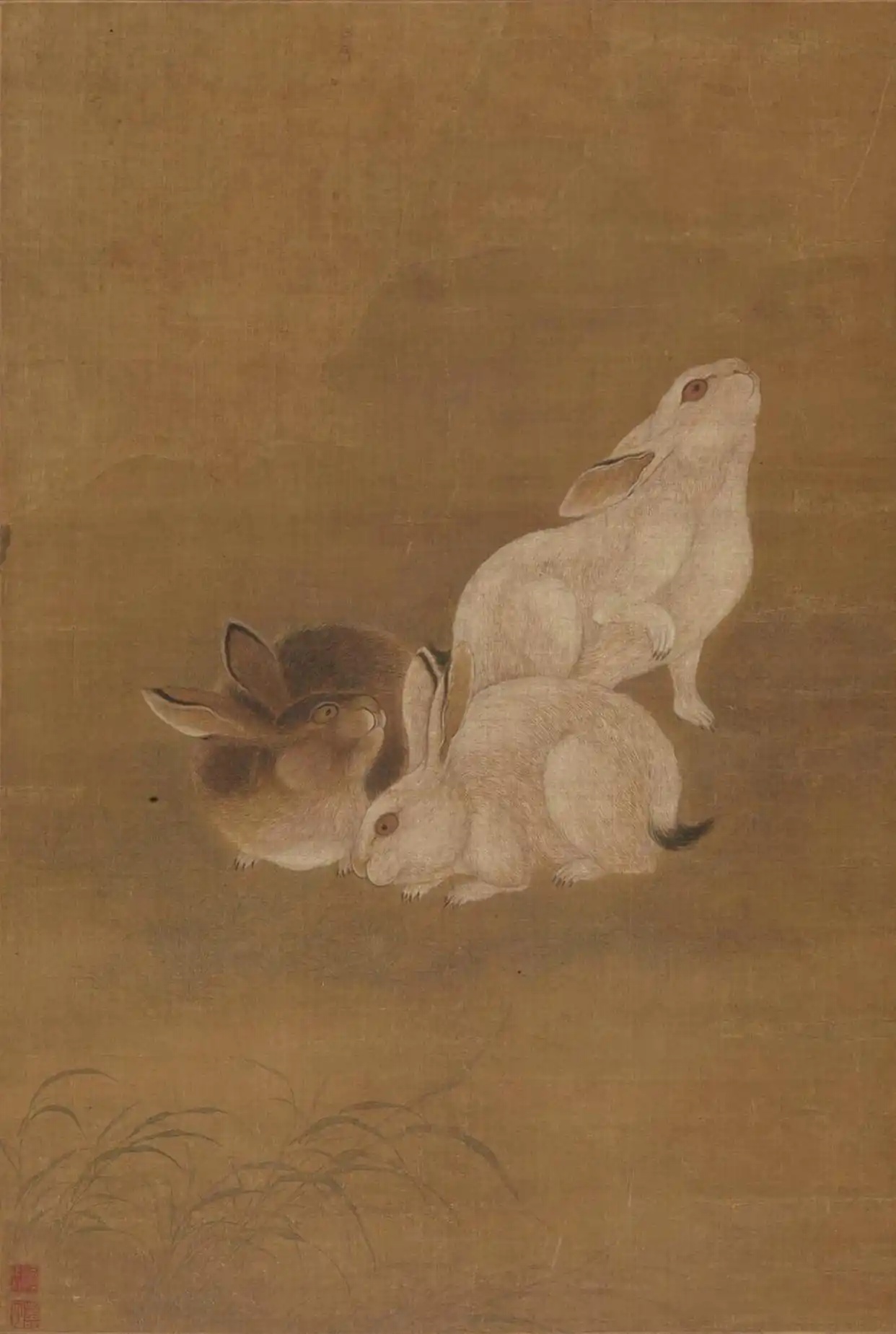 《三兔图》作者清代龚吉,绢本设色,尺寸67.3厘米 x 40.6厘米,现藏于美国大都会艺术博物馆