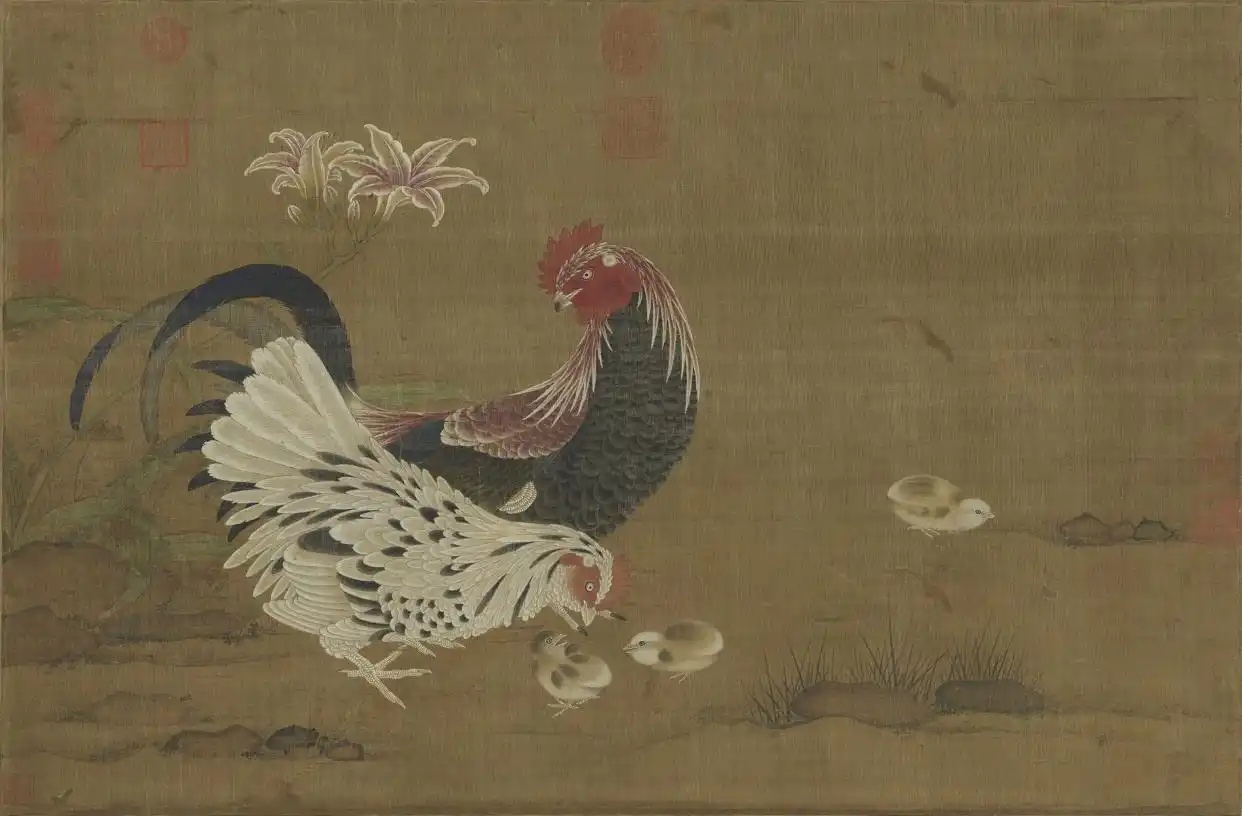 《鸡图》作者明代佚名,绢本设色,尺寸49.4厘米 x 74.8厘米,现藏于台北故宫博物院