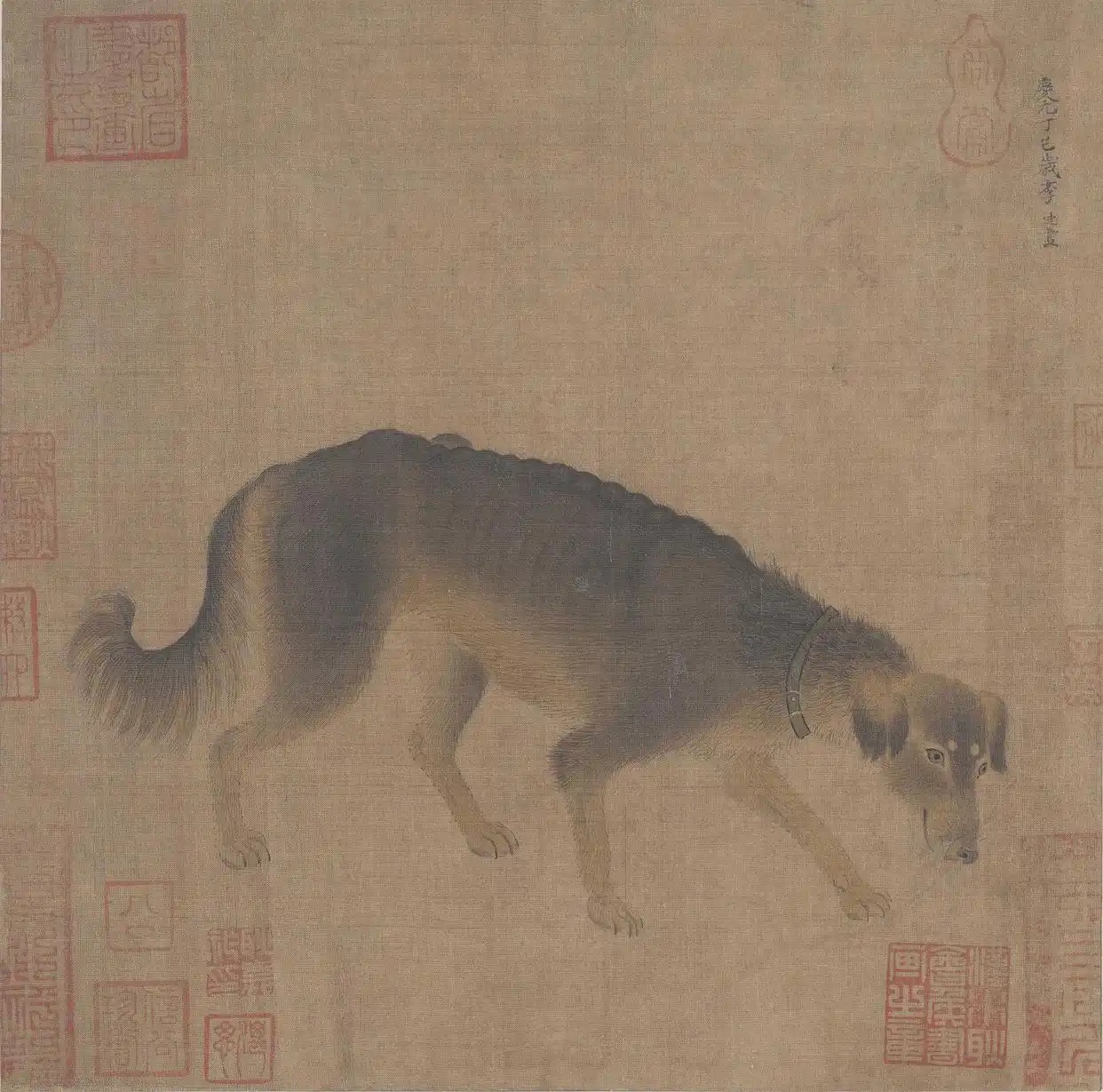 《猎犬图》作者南宋李迪,绢本设色,尺寸27厘米 x 27厘米,现藏于北京故宫博物院