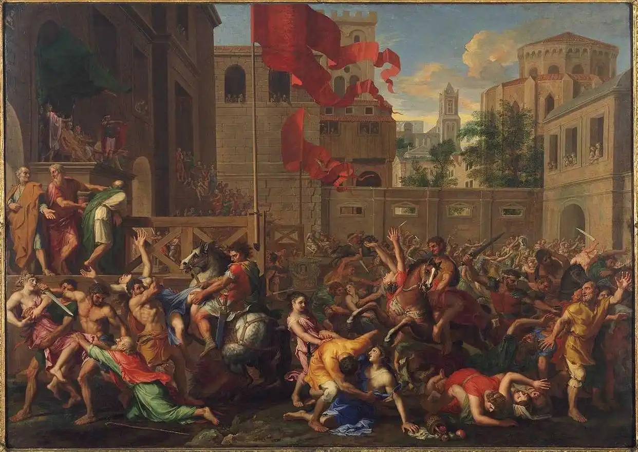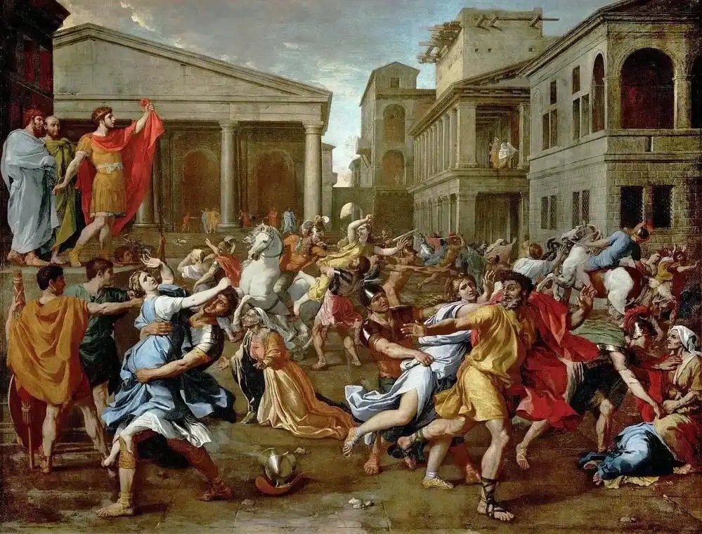 普桑(Nicolas Poussin)于1634-1635年创作了《抢夺萨宾女人》(The Rape of The Sabine Women),尺寸154.6厘米 x 209.9厘米,藏于大都会。