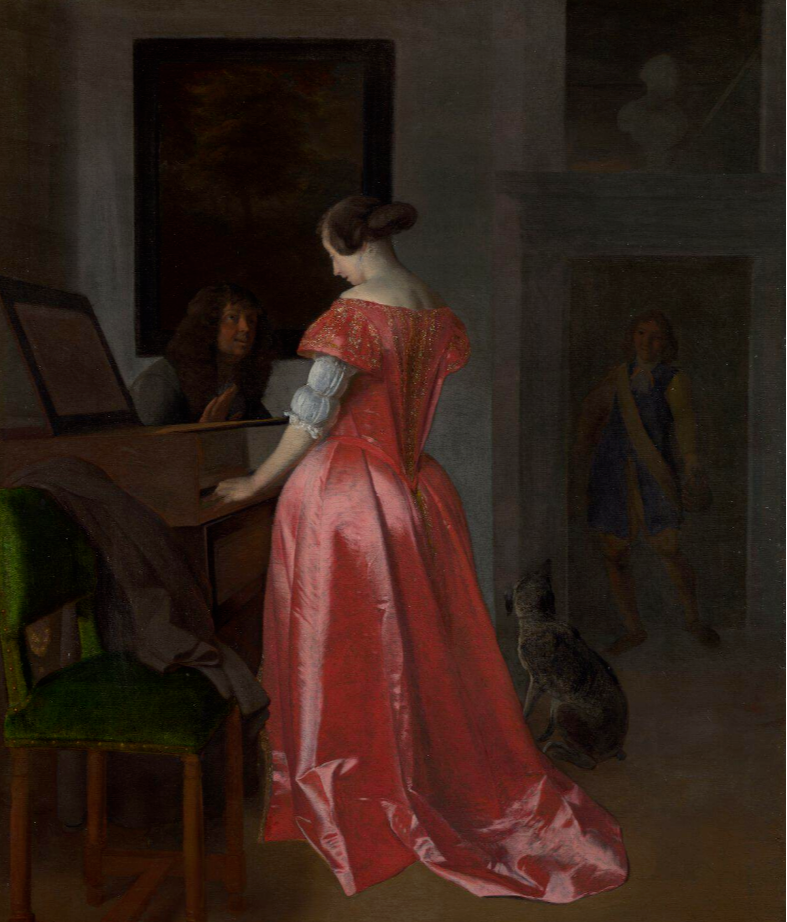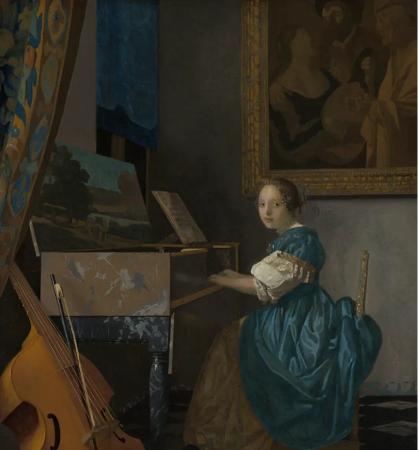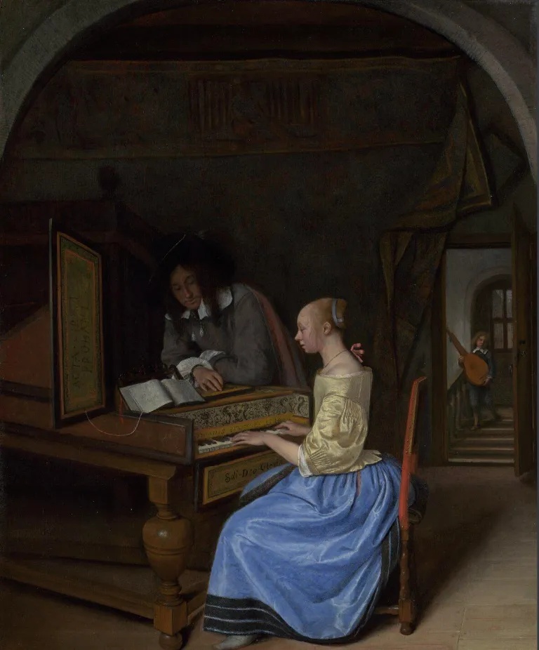羽管键琴能有多精致? 02 这两幅极为相似的画作《一个女人站在羽管键琴前,一个男人坐在她旁边》与《一个女人在演奏维金纳琴,另一个在唱歌,一个男人在拉小提琴》都出自荷兰黄金时代的画家雅各布·奥赫特维尔特(Jacob Ochtervelt,1634—1682年)。两幅画中的女人不仅外形服饰相似,演奏的也是同一种乐器,即羽管键琴。 羽管键琴是一种通过键盘演奏的乐器。琴弦在音板上处于拉紧状态,音板上安装在木箱中;音板会放大琴弦的振动,以便听众可以听到。与管风琴一样,羽管键琴可能不只有一个手动键盘,甚至还有踏板。羽管键琴还可能带有停止按钮,用于增加或减少额外的八度音;有些羽管键琴还可能有水磨音栓——将水磨皮革或其他材料条与琴弦接触,使琴弦的声音变弱,从而模拟拟弹拨鲁特琴的声音。 羽管键琴广泛应用于文艺复兴和巴洛克音乐中,既可作为伴奏乐器,也可作为独奏乐器。在巴洛克时期,羽管键琴是连续奏组的标准组成部分。通低音部分是这个时代许多音乐作品的基础。18 世纪末,随着古钢琴的发展(以及19世纪钢琴使用的增加),羽管键琴逐渐从音乐舞台上消失了(除了在歌剧中,它继续用于伴奏宣叙调)。在20世纪,它再次复兴,被用于具有历史意义的古乐演奏、新作品创作,在极少数情况下,也被用于某些风格的流行音乐(如巴洛克流行音乐)。 羽管键琴是整个类似的弹拨键盘乐器的统称,而维金纳琴(Virginal)是它的一种。 这幅《坐在羽管键琴前的年轻女子》(A Young Woman seated at a Virginal)来自荷兰黄金时代最伟大的绘画大师之一约翰内斯·维米尔(Johannes Vermeer,1632—1675年)。维米尔目前存世的作品不多,主要以风俗题材为主,却创造了不少经典杰作,如广为人知的《戴珍珠耳环的少女》。其不少画作中都有乐器的出现,维金纳琴便是其中很常见的一种。 维金纳琴是一种更小、更简单的矩形或多边形形式的羽管键琴,可能起源于一种在15世纪使用的圣诗乐器;维金纳琴每个音符只有一根弦,琴弦一般与琴盒长边上的键盘平行。维金纳琴名字的由来已无从考证,它可能源自拉丁语virga,意思是一根杆,也许指的是放在琴键末端的木插孔,但这尚未得到证实;另一种可能性是,这个名字源自“处女”一词,因为它最常由年轻女性演奏;也有可能是其声音就像一个年轻女孩的声音(vox virginalis)。 虽然欧洲许多早期的维金纳琴都是用普通木材制作的,但它们很快就被赋予了丰富的装饰,这也让许多此类乐器得以保存下来。从表壳边缘、护栏和铭条上的造型,到象牙、珍珠母、大理石、玛瑙、龟甲或半宝石的装饰,再到复杂的绘画……维金纳琴上的装饰可谓丰富多彩。