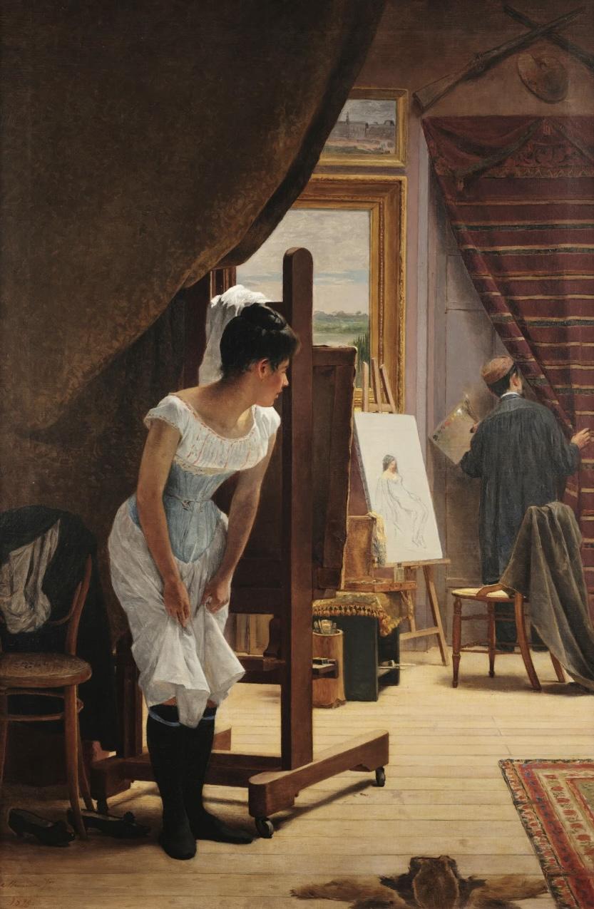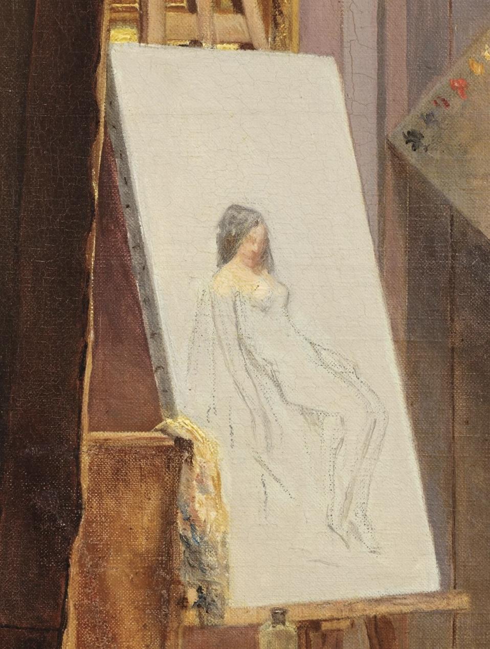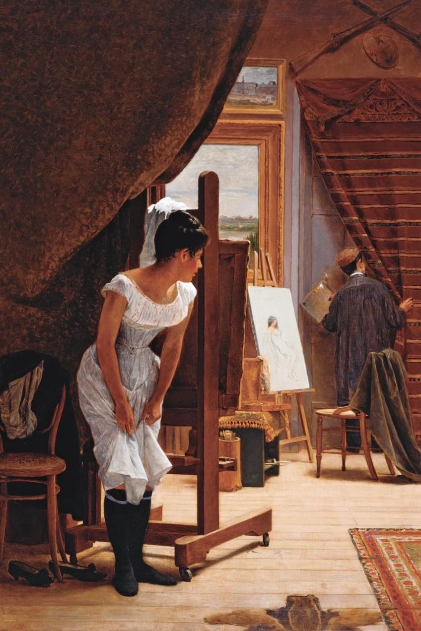 评述:画家正在进行的工作,被不合时宜地打断了,他站在门口,从门缝里查看看来人是谁。模特是一个黑发女孩,尴尬地躲在画架和窗帘后面。女孩的衣服放在旁边的椅子上,画架上刚刚描绘出轮廓,显示这是一副人体。