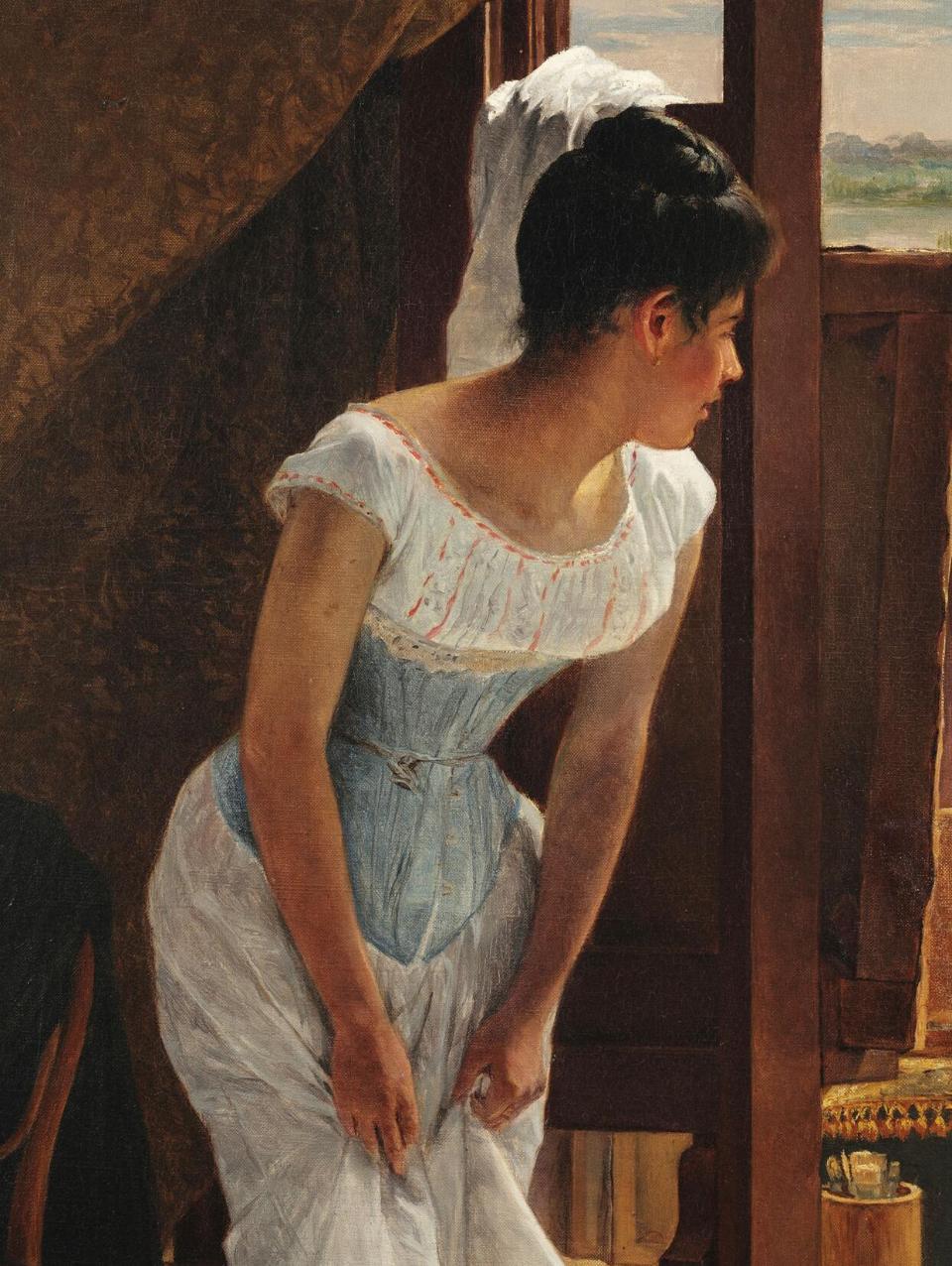 这幅画展示了一个非常私密的场景,关闭的门和门帘是为了隔开外界的视线,访客扰乱了这个场景,而画作则把这个不该被看到的私密场景,彻底呈现出来。而且其中的细节耐人寻味,画作上的女孩是披散着头发,模特则梳着整齐的发髻,还穿着长袜。