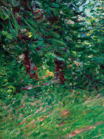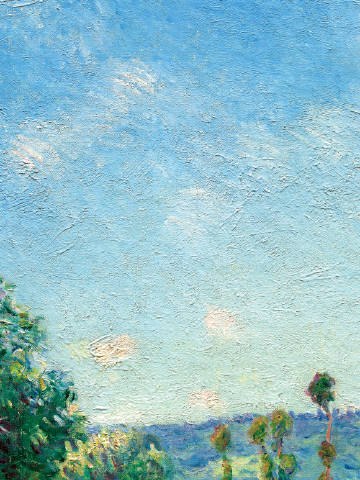 《Sahurs Meadows In Moring Sun》创作于1894年,传递出清晨的宁静与清新,明快温暖的画面中,绿意、蓝天和金稻交织,展现出画家对于自然光线的敏感。