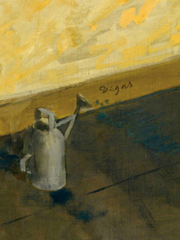 画作左侧下的浇水罐是芭蕾舞排练室的标志性工具,用于防止舞者在排练时扬起灰尘。德加巧妙地将浇水罐融入画面,成为视觉上的双关元素。右侧的舞者模仿了浇水罐的形状,形成了有趣的视觉对比。
