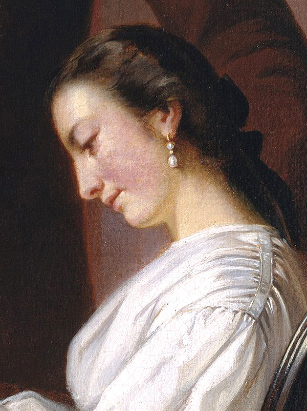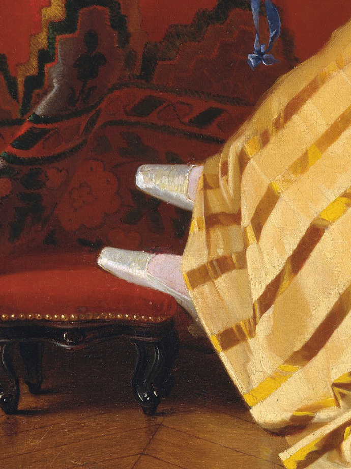 这样的场景可能是相机很难捕捉到的,因为它是作者带着一种情感或情绪创作的结果;此外,画面通过细节展示了十九世纪中产阶级的生活方式,无论是桌上的水晶玻璃瓶还是女子脚下的脚凳,都在描绘着一种生活方式……暗示着一种来自过去的传承。