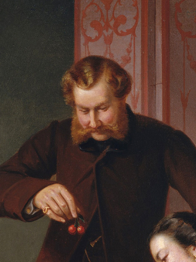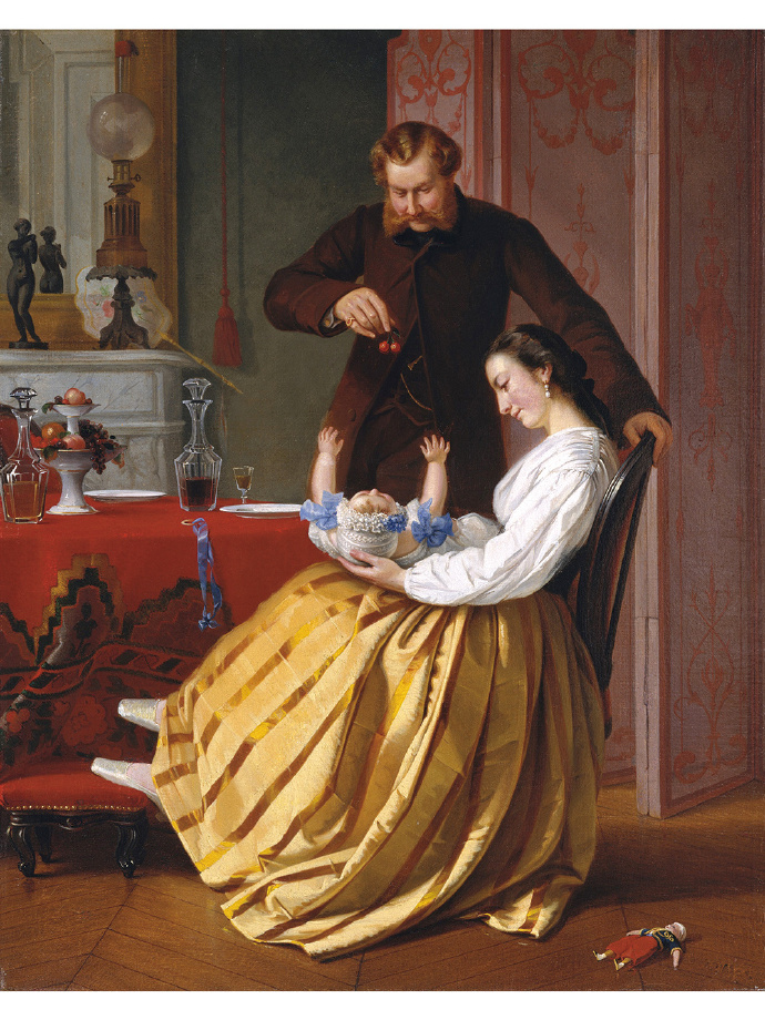 在这幅绘于1851年的油画中,母亲坐在画面中间,温柔地抱着孩子,父亲俯身,唇角含笑,拿着手中的红樱桃逗弄。在穿越时光之后,她的画作依然唤起人们对家庭温情与生活之美的共鸣——其艺术价值与历史意义,已在当代艺术史中获得应有的辉煌地位。