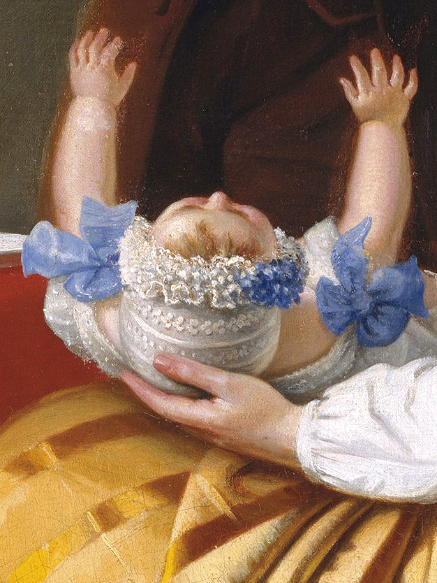 在《家族的肖像》中,斯宾塞以细腻的笔触,描绘了父母逗弄婴孩的画面——房间装潢精致,少妇坐在椅子上手托女婴;留着络腮胡、身形魁梧的父亲温柔而专注地凝视爱女,手拿樱桃逗弄宝贝,小女婴则向空中伸出小手。