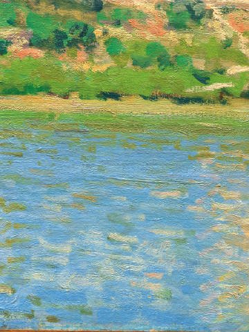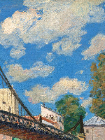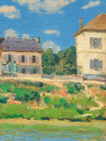 西斯莱摒弃传统风景画的细腻描摹,以松散的笔触和色块堆砌物象。例如,近观水面可见跳跃的色点,远观则形成统一的波光效果,体现了印象派对“视觉真实”的追求。