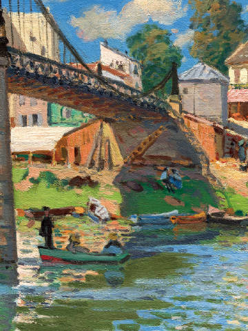 这幅画描绘了巴黎西北郊塞纳河畔的工业时代铁桥,却以诗意笔触将人造结构与自然景观完美融合,成为早期印象派探索现代性主题的典范。