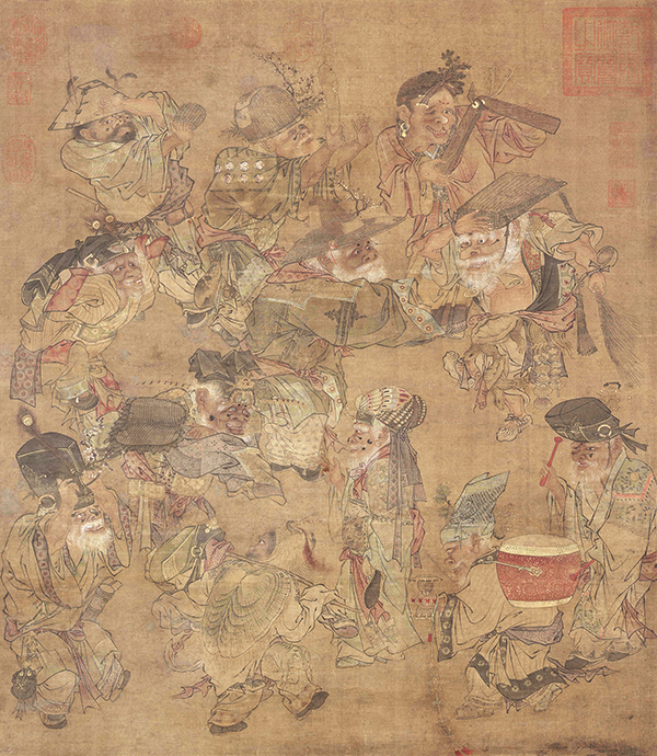 简介:“傩”的含义是借祭神来驱除厉疫。举行大傩时,人们戴上各种奇异的面具,持武器鸣法器,做出与鬼神作战的种种舞蹈姿势。此图正是这种风俗的真实写照。图中人们有的戴着假面具,有的拿着法器,有的击鼓,手舞足蹈,反映了人们驱除疠疫的美好愿望。该图现藏于北京故宫博物院。