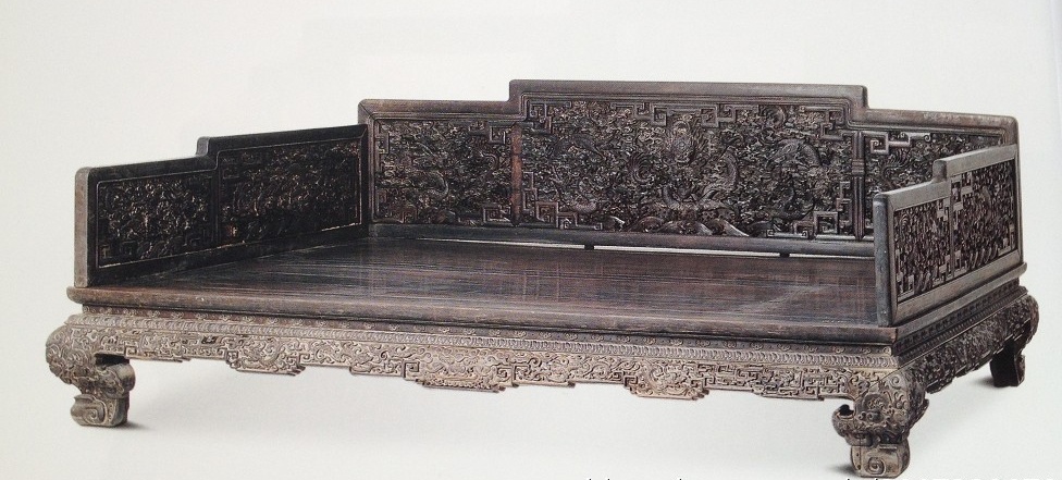 最奇者,清宫旧藏之罗汉床,标注为红木九龙纹床,并非紫檀木,令人匪夷所思。在澹宁堂参观时,灯光昏暗,无法近前细观,眼前只黑乎乎一片,无从断定木质。仅能从用料的体量感加以猜测:整器除弯腿内向的勾云部分为拼补外,其余皆为整木,尤其是正侧围子虽为阶梯下沉装,实则上部的横枨均出自一木,用料之大胆奢侈,超乎想象。