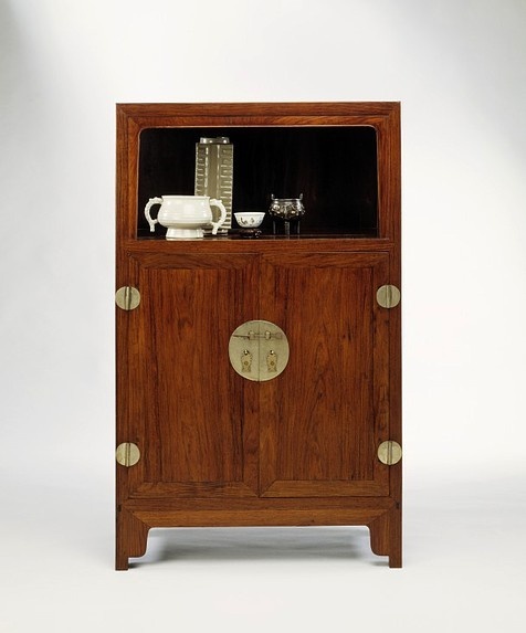 丁15号亮格柜。1980年入藏第14号,铜活全部后配,部分立柱及后背板也经过修配。尺寸小巧,是橱柜类中精致的造型,1米2的高度,摆古董的话适合坐着观赏。
