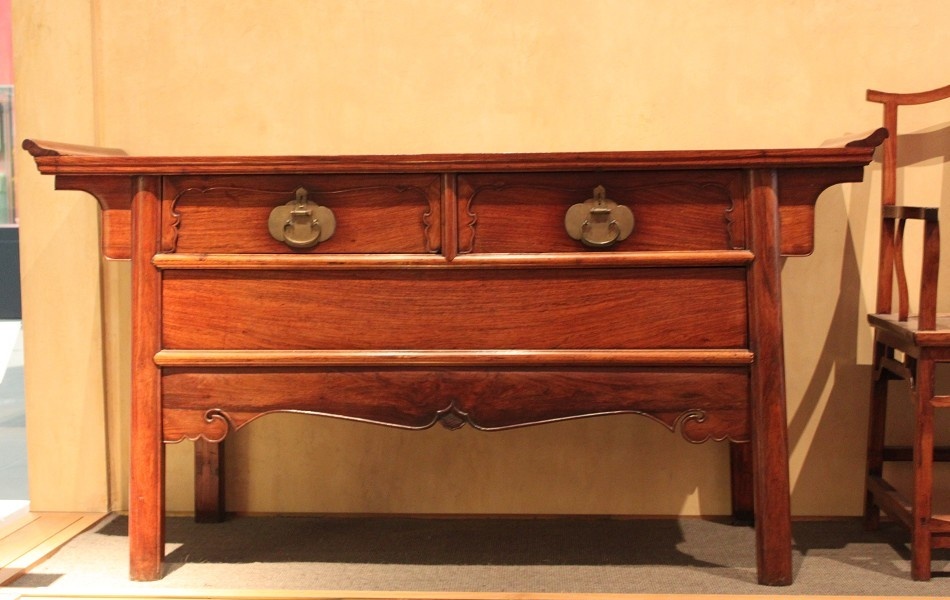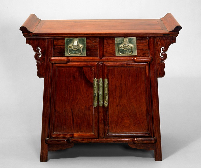 戊9号翘头联二橱,原为艾克先生收藏,首见于《花梨家具图考》118页,第97号。书中有杨耀先生1939年绘制的尺寸详图。体量大,凝重、实用。