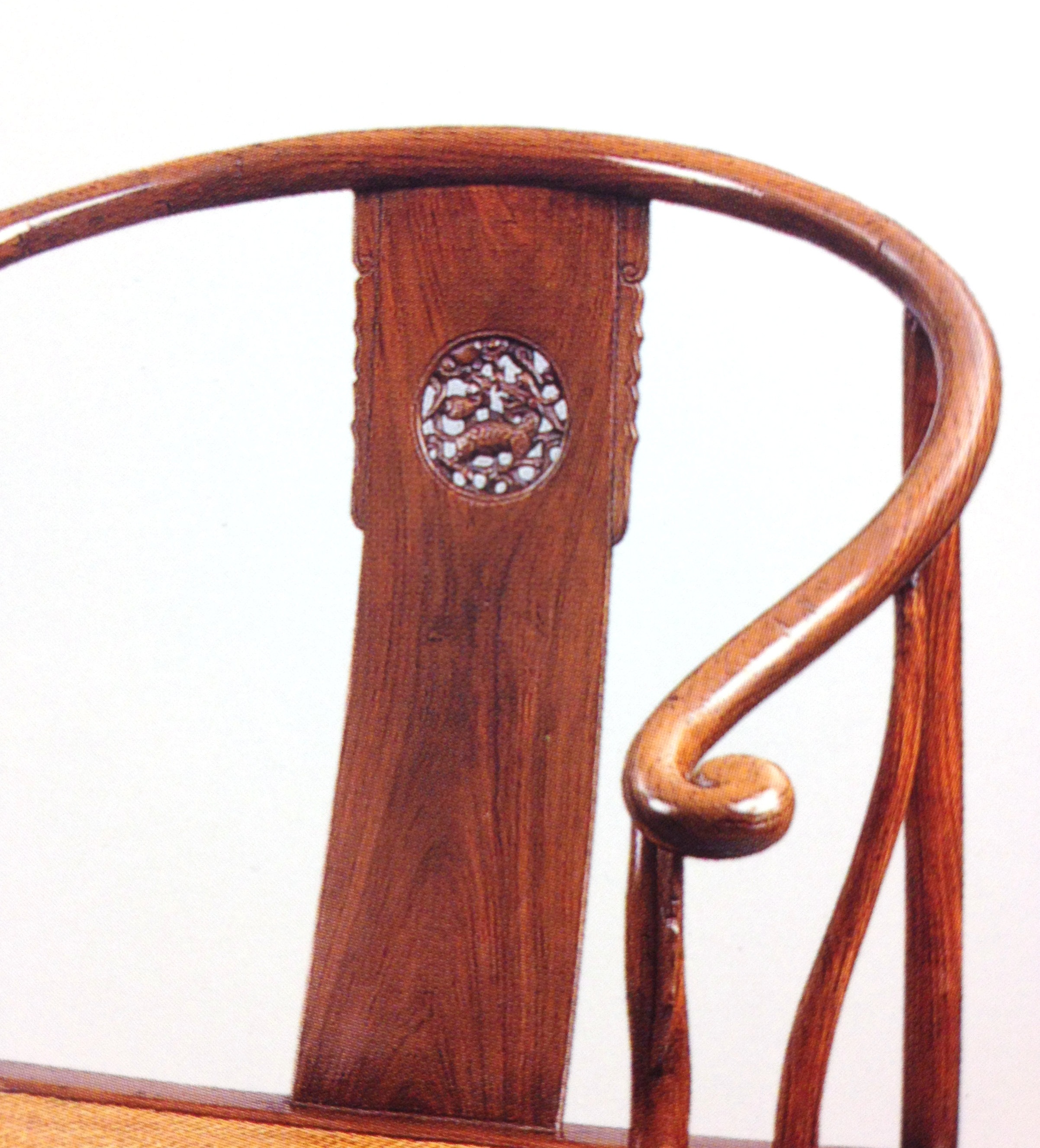 圆形背光的做法,比之常见的如意形开光少的多。除此之外,其他背板上圆形开光的,均未见透雕。比如经眼录上北京藏家的一件,埃斯肯纳新的单只圈椅,以及原先檀香山博物馆拍出的一件南官帽,背板镶嵌圆雕的黄杨螭龙等,都未透雕。参见本博另一篇博文《椅子背板上唯美的雕刻》。