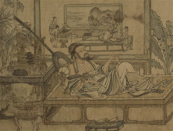 此幅《消夏图》构图上左繁右简,把大家的眼光引汇到画面左边的主人公身上。主人公头戴小冠覆乌纱,身着道服,赤足卧于榻上纳凉,背后斜置一阮咸(古琵琶的一种),一副潇洒闲适的士人形象,他即是“竹林七贤”之一的阮咸。其榻后放置一方桌,桌上有茶器与插花,清雅闲适。