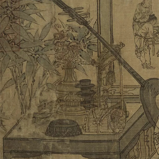 现在,我们来一窥此画中的茶事茶韵,前景主人公阮咸背后的方桌上,放置有一荷叶盖罐,一汤瓶和一摞盏托,旁有砚台与书画一包。后面的长颈瓶里满插灵芝,乐器架上挂着铜钟一只。茶趣乐玩,一派风雅书斋生活的气息。