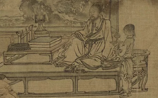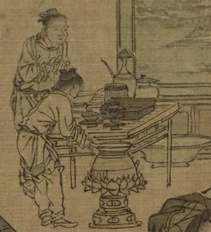 我们观察屏风画中的烹茶之器是莲花托座上的风炉,炉上放着一长柄铫子,可见屏风中此时的烹茶方式是煎茶。煎茶是将细研成末的茶投入滚水中煎煮,南唐入宋的徐铉在咏茶之作中言道“任道时新物,须依古法煎。”宋人虽时兴点茶法,但是煎茶被宋人赋予崇古的意味,而为士人所重,重在其古意,融于这幅消夏图中更是显现了宋元风雅文士尚古的精神世界。