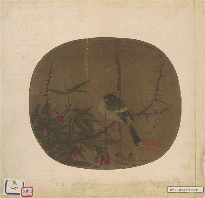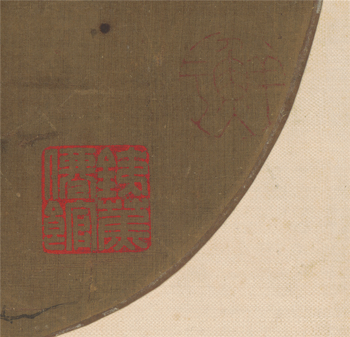 宋代是团扇流行的高峰时期,凡画务求精工细描,形象追求生动逼真,画风富丽典雅,富有装饰意趣。其功能和价值,远远超越了团扇面本身的价值,更多的成为展示绘画艺术的载体,成为文人墨客竞相把玩的艺术鉴赏品。宋代的团扇绘画,也因此成为宫廷绘画的一种表现形式,尤其是在南宋。这些团扇绘画作品既有名家所绘,也有很多无款的作品。本件作品构图规整,技法娴熟老练,敷色浓而不俗,代表了南宋时期工笔花鸟画的水平。