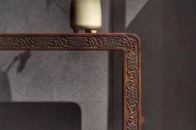 清早期·铁梨缠枝牡丹纹卷书案,长144.5、宽30、高84厘米,雕刻精美、玲珑剔透。铁力木属大型树种、纤维较粗,通常不宜精雕细刻,不过也有少数色深油足、材质细腻、致密宜雕的高山老料,此案即为明证。
