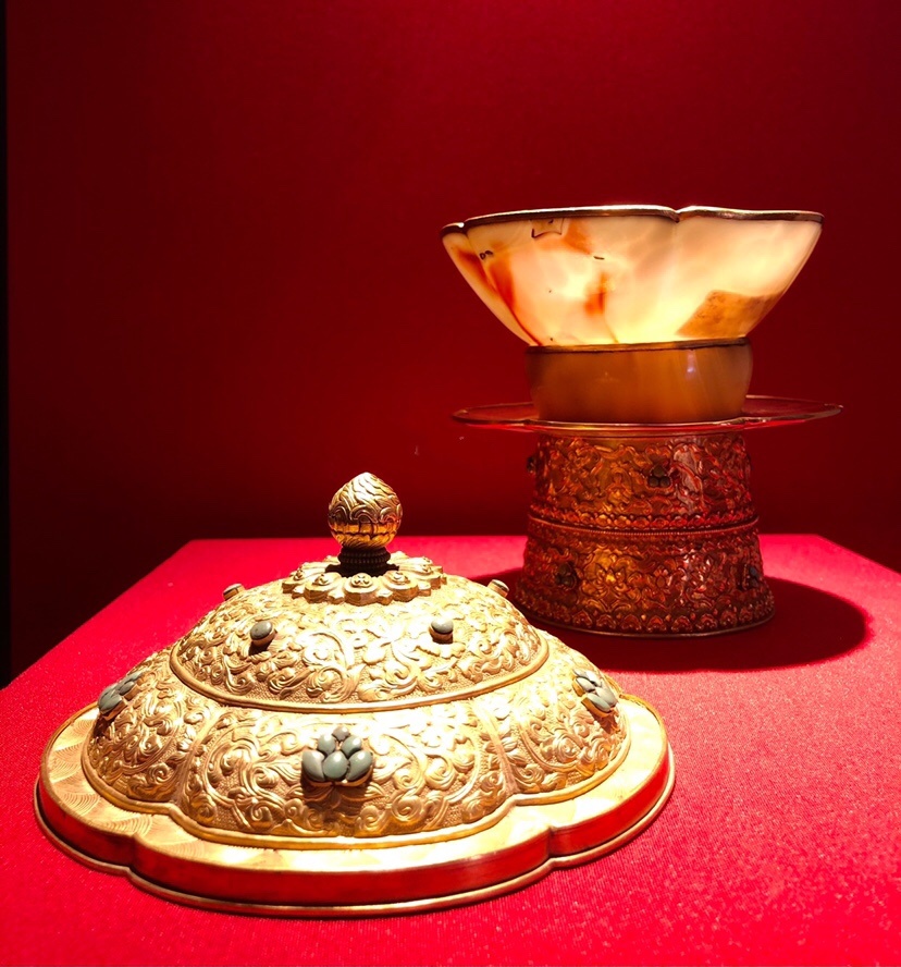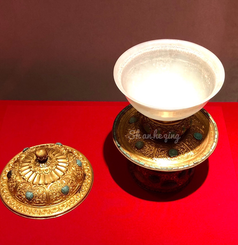 这是一件藏传佛教中常见的供碗,碗以白玉雕成,盖、座以金成造,合而为一,更显名贵。盖上有藏文咒为饰,其余部分均嵌饰松石,表现出浓厚的藏族文化的风味。”