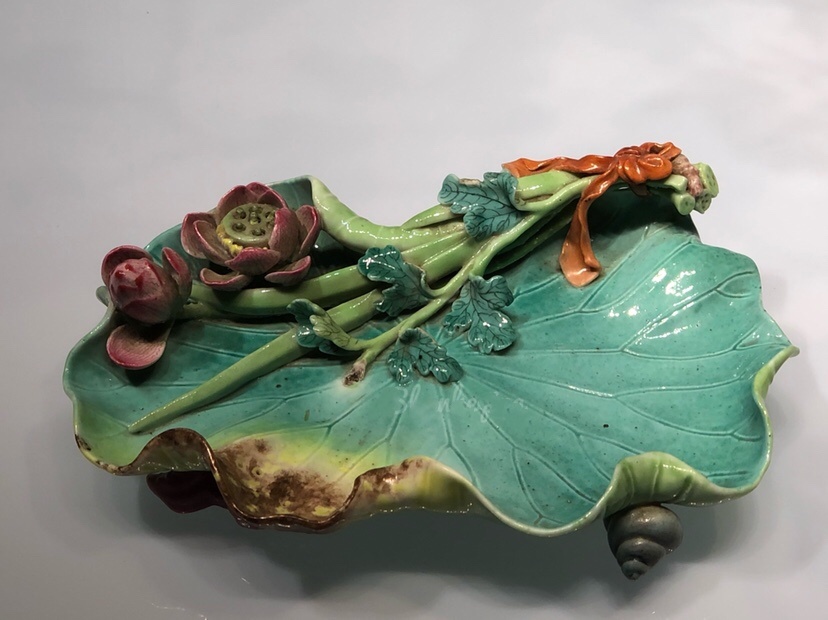 盘呈荷叶形,叶面翻卷起伏,叶梗从叶后过枝而上,叶面边缘处贴塑含苞待放的花苞与莲实,莲蓬中有可活动的莲籽,器底粘有田螺和菱角形足。底书青花篆书“乾隆年制”四字款。