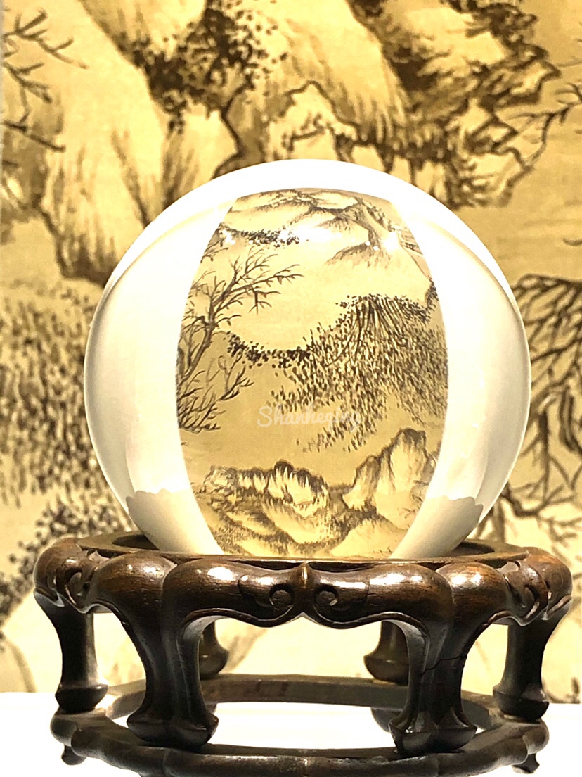 “球为圆形,水晶制成,通体透明,无任何杂质瑕斑。径7.8厘米。球下有呈镂空雕花红木座。
