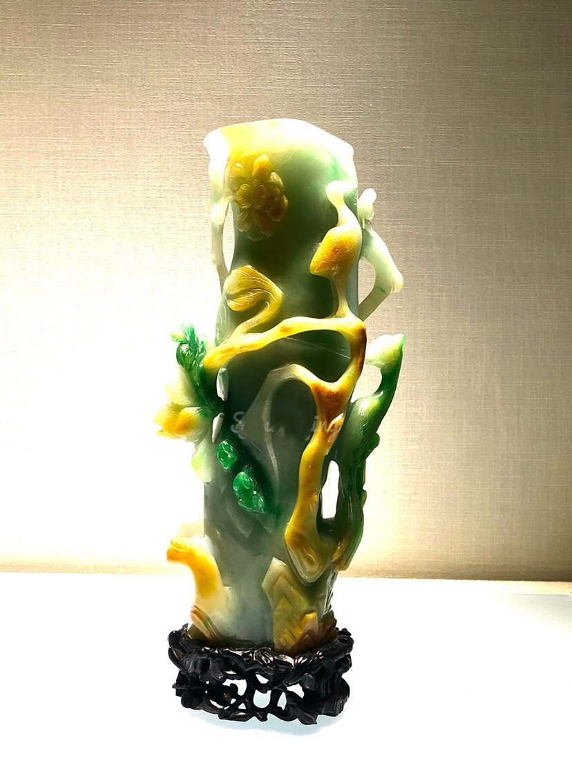 翠玉制品在清中期后才大量出现,但多为佩饰、首饰等小件器物。此件翡翠白菜花插虽为翠根琢制而成,质地一般,干绿色中有褐色的绺纹,工匠利用了这褐红的翡色雕琢成叶脉纹,层次更加分明,立体感极强,一些叶片边缘的黄褐色更接近于自然状况。”