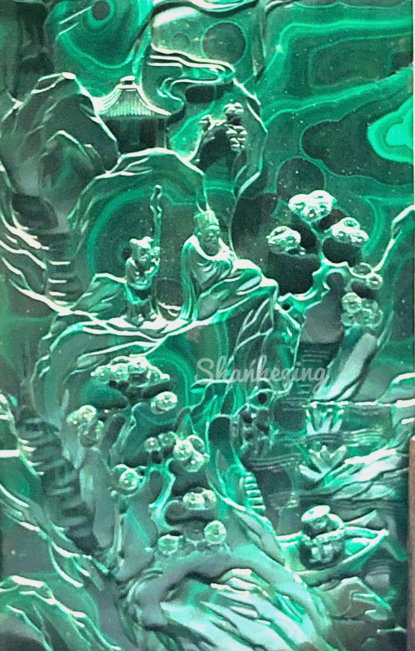 此插屏使用的孔雀石质地细密无孔,颜色鲜亮纯正,深浅不同的条带状纹理清晰夺目。工匠充分利用了上述特点,使一片郁郁葱葱、富有生机的山景跃然屏上。”