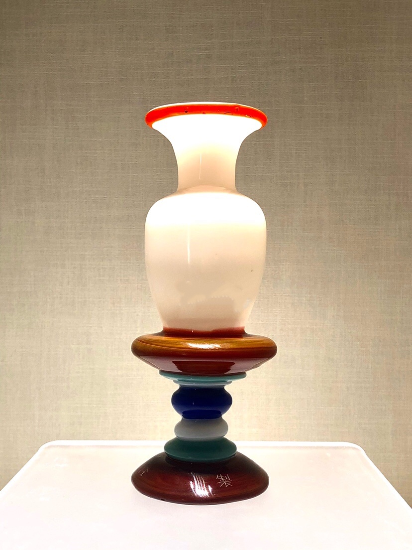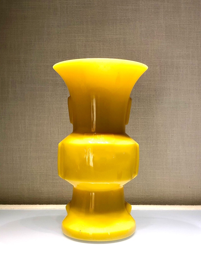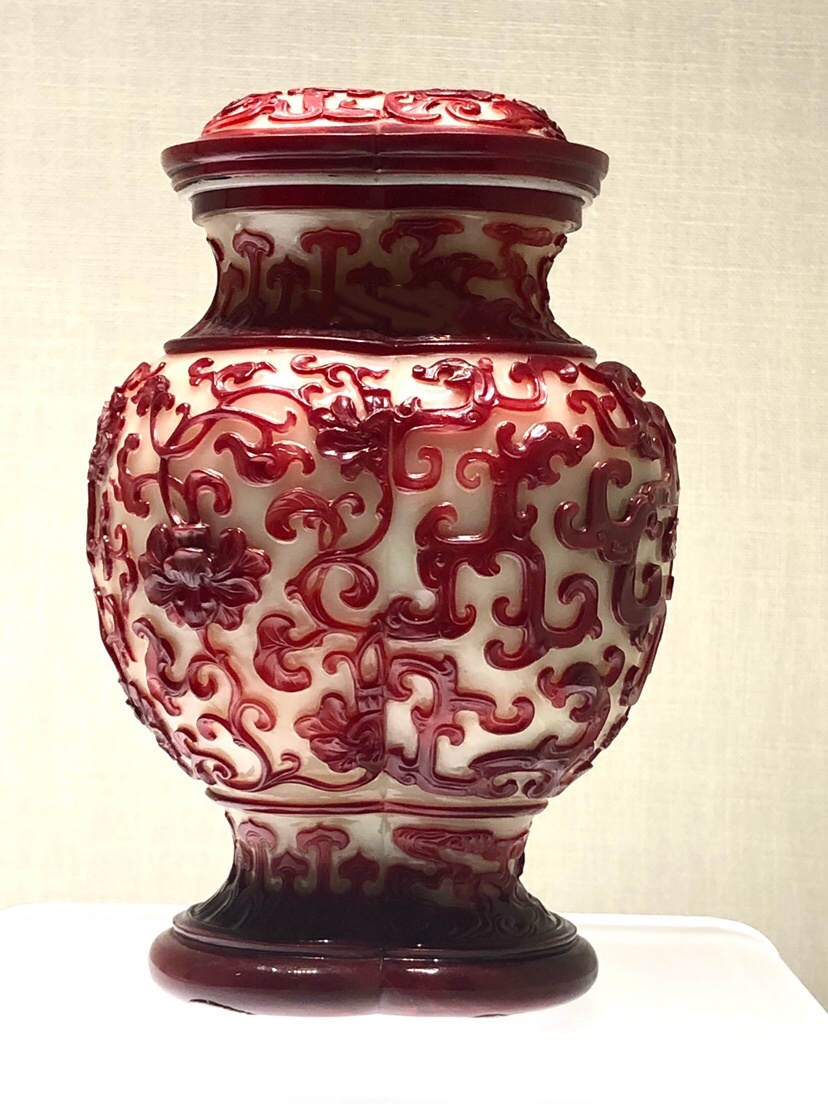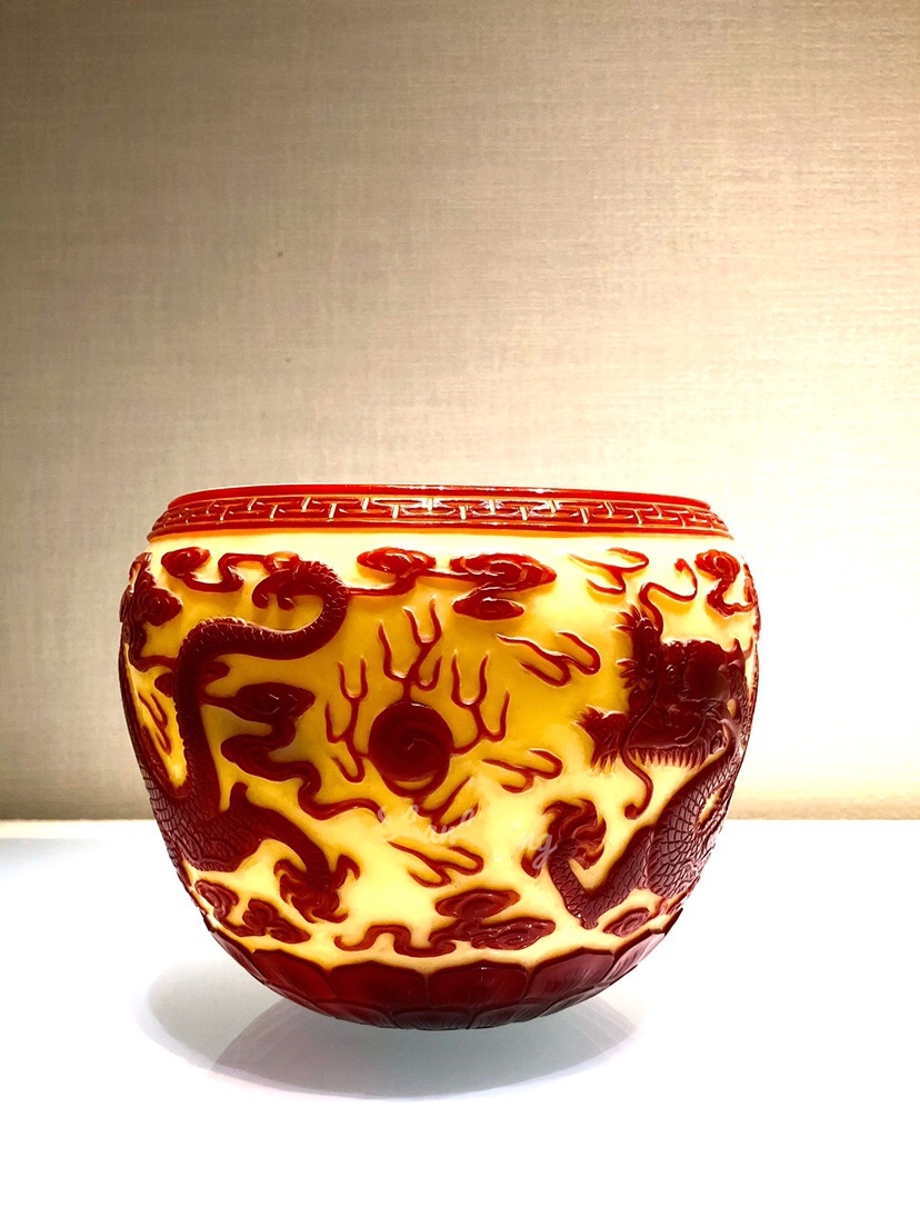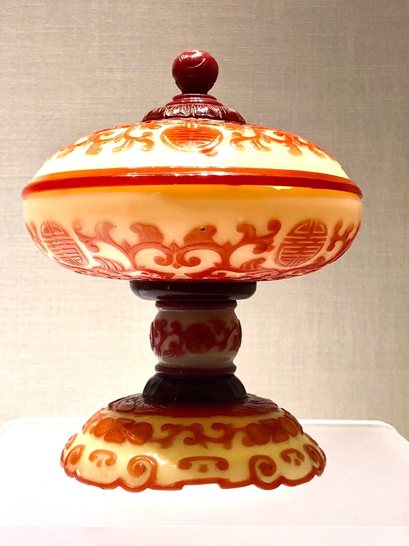 9、黄色地套红色玻璃团寿花卉纹盖豆。